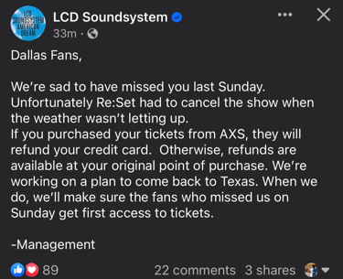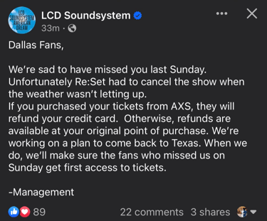 In June 2023 I drove 4 hours to see them in Dallas at something called Re:Set, which was a touring outdoor festival that will probably never happen again. The lineup was Big Freedia, Idles, Jamie XX, and LCD Soundsystem, all on the same stage. We got there early and were just a couple of rows back from the stage. It was the day before my birthday and everything was perfect. Midway through Idles set (who killed it) they stopped the song and told everyone we had to leave because there was a threat of a thunderstorm. Thousands of people went into a nearby building and waited for 3 hours to see if the show would get canceled. Eventually, we found out it did get cancelled and I had a very depressing car ride home in the rain with my friends. I was really upset but I understood that it was not the band's fault the show got canceled.